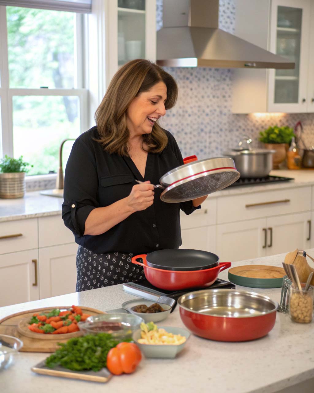 Skincare serum in natural daylight—clean bathroom, soft smile, handheld feel. High-res, shallow depth of field, social ad style.