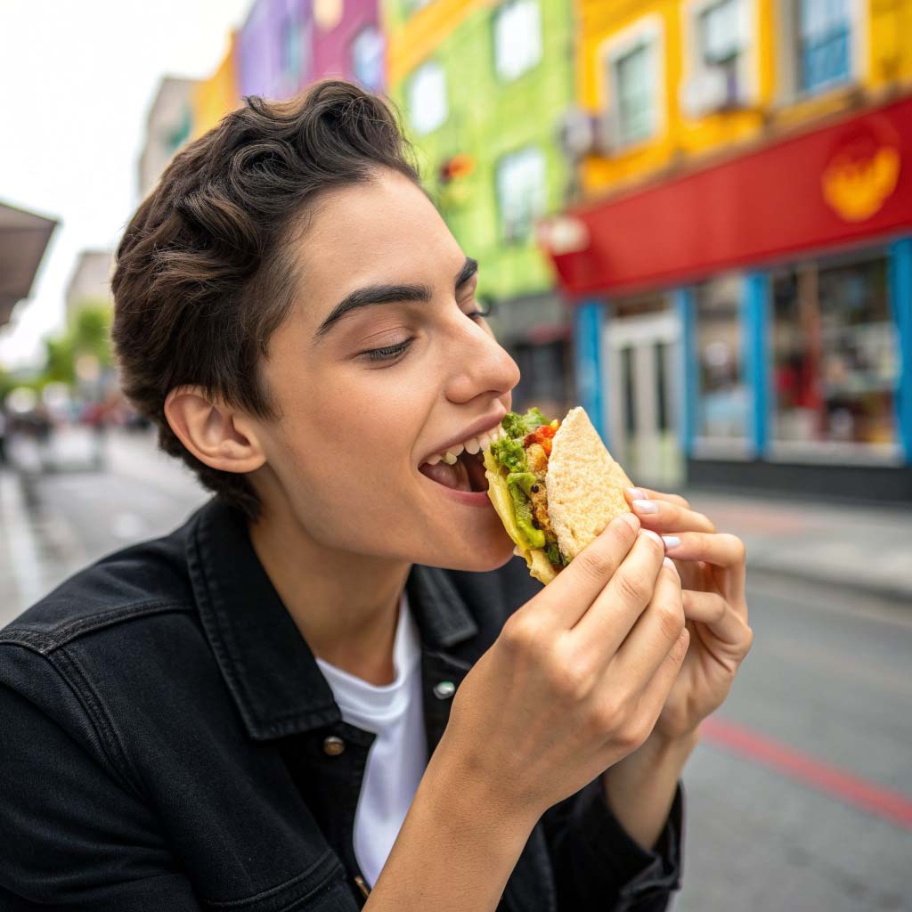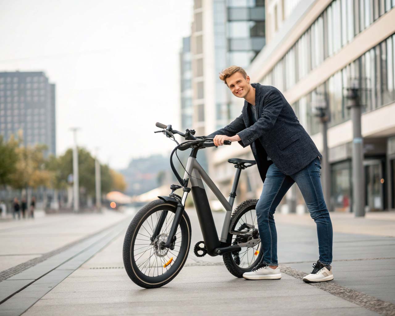 Modern e-bike in the urban feed—casual-smart style, natural light, confident smile. Built for discovery and saves.