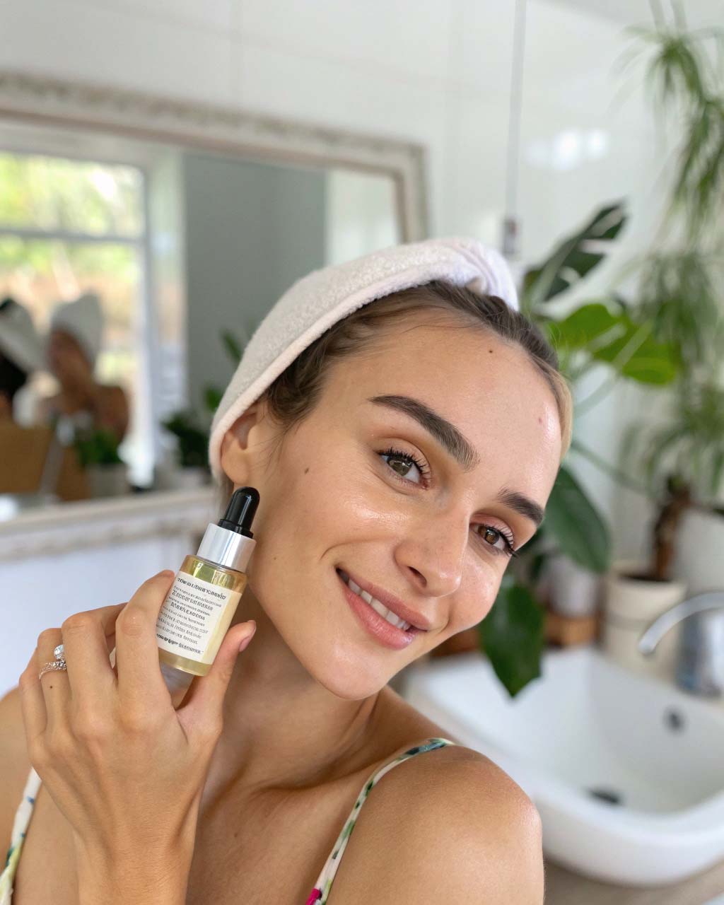 Skincare serum in natural daylight—clean bathroom, soft smile, handheld feel. High-res, shallow depth of field, social ad style.
